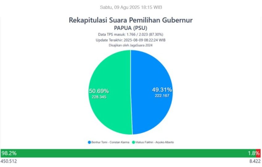 Lingkarperistiwa.com, – Proses rekapitulasi suara Pemungutan Suara Ulang (PSU) Pilgub Papua yang dipantau platform JagaSuara menunjukkan perubahan signifikan. Pasangan calon nomor urut 2, Matius Fakhiri–Aryoko Alberto, kini memimpin sementara setelah sebelumnya tertinggal dari pasangan nomor urut 1, Benhur Tomi–Constan Karma.